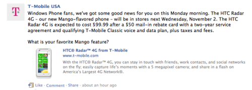 最近幾個(gè)月,運(yùn)行Windows Phone 7.5 Mango系統(tǒng)的手機(jī)是相當(dāng)引人關(guān)注了。而曝光于9月份的HTC Radar 4G就是這樣一款“芒果”手機(jī)。如今根據(jù)BGR網(wǎng)站的報(bào)道,美國(guó)T-Mobile將于11月2日正式發(fā)布這款手機(jī)。T-Mobile稱(chēng)HTC Radar 4G的推出時(shí)間將會(huì)是在下周——11月2日,屆時(shí)這款手機(jī)將享受50美元的郵寄折扣,兩年合約售價(jià)最終僅為99.99美元,約合人民幣640元。
