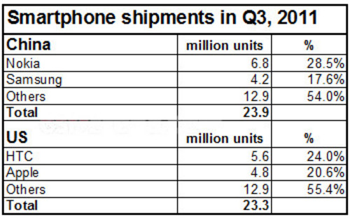 據(jù)Strategy Analytics報(bào)道,今年第三季度中國(guó)的智能手機(jī)出貨量約為2400萬(wàn)臺(tái),環(huán)比增長(zhǎng)58%,遠(yuǎn)遠(yuǎn)超越此前位于榜首的美國(guó)。另外,在第三季度中國(guó)智能手機(jī)市場(chǎng),諾基亞智能機(jī)的銷量仍然位居第一,三星則居于第二,而這兩家智能手機(jī)的市場(chǎng)占有率之和已接近50%。